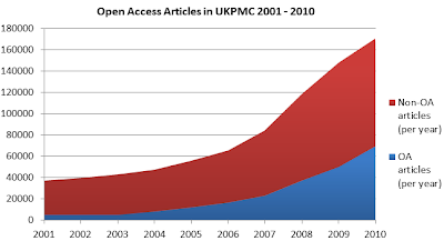 graph below shows the growth of open access articles in UKPMC between 2001 and