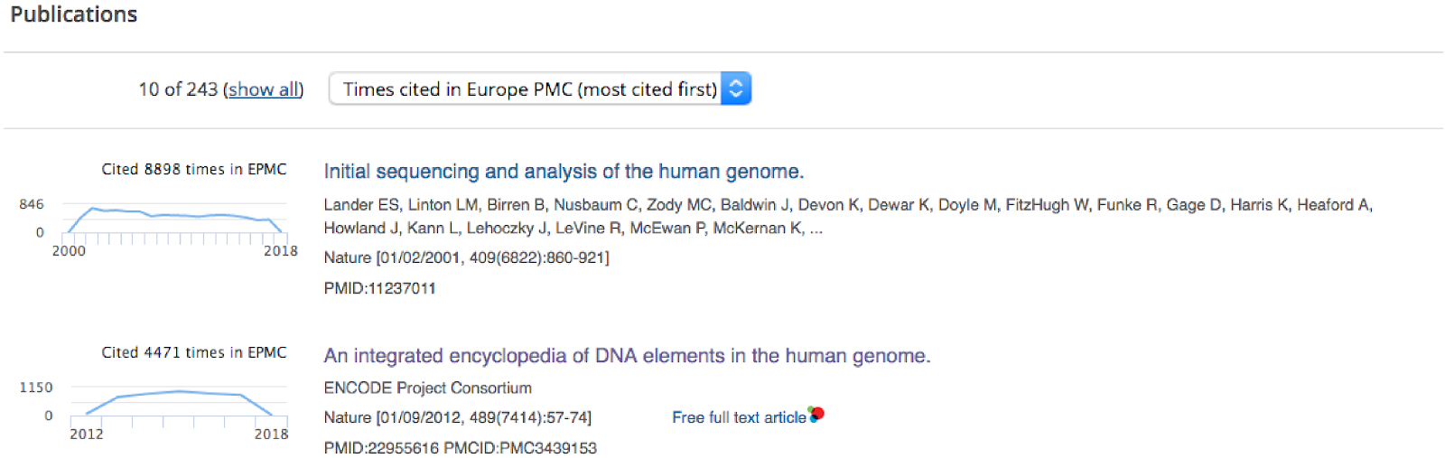 Open citation data also enables development of the powerful discovery tools. For example, in Europe PMC it is possible to sort search results by the number of citations to find the most highly cited articles on a particular topic. Citation counts for each paper are also displayed in the results list.