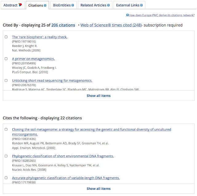 An important thing to mention here, is that citation information is matched to Europe PMC records based on available metadata. This means that if a citation can be confidently identified, it will appear as a publication link. Readers can thus follow the reference trail through the citation network, and find research relevant to their area.