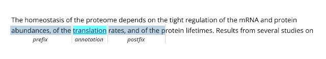 Europe PMC Annotation Submission System accepts sentence-based annotations and named entity annotations. An example of a sentence-based annotation is a protein-protein interaction, while a chemical name can be represented as a named entity. All annotated concepts must be linked to ontologies and data resources. For instance gene/protein annotations link to a corresponding UniProt record. Submitters are also asked to specify the precise location of the annotation in the text, using prefix and postfix tags.